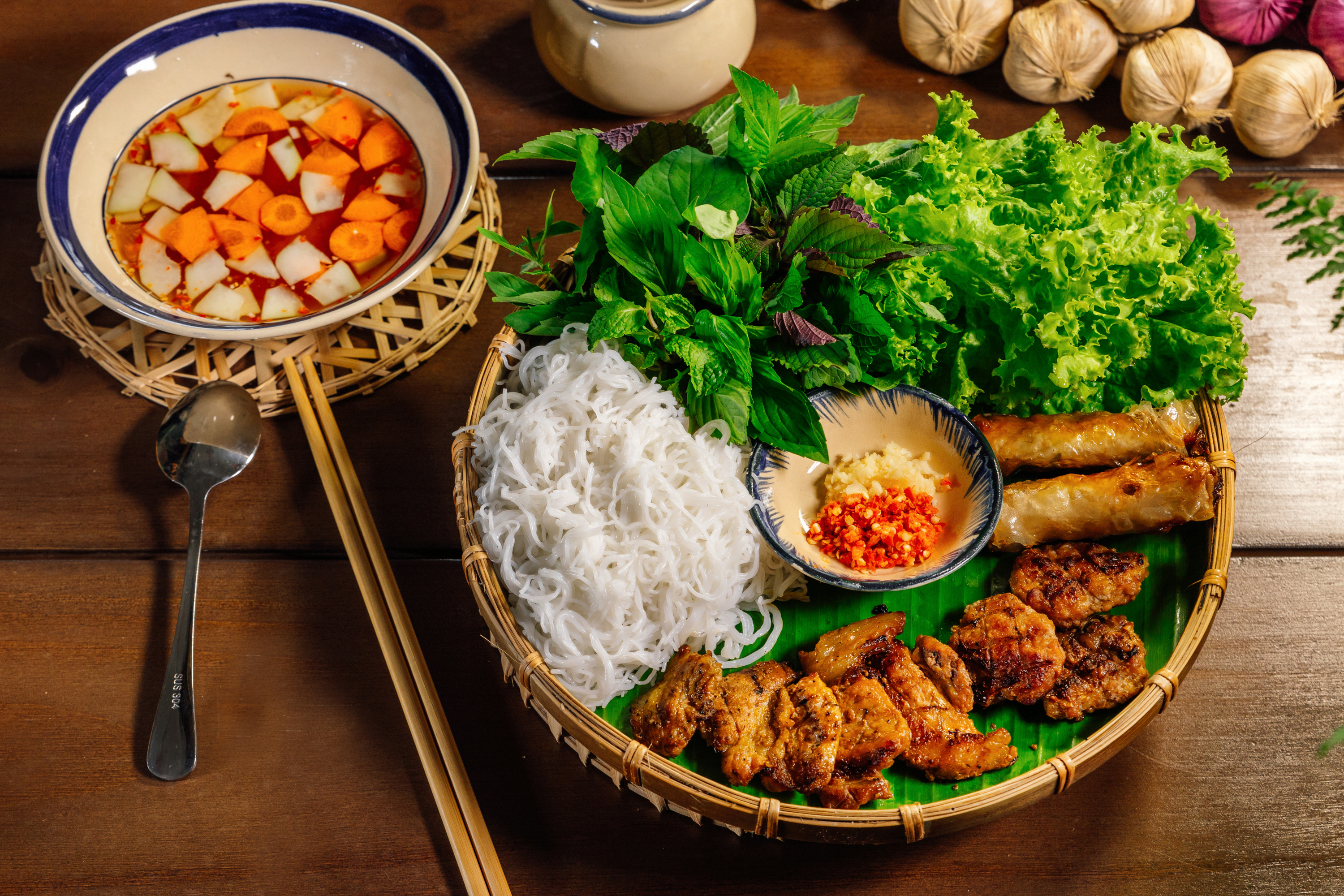 Món gồm bún, thịt nướng, chả viên, nem thịt, nem tôm, rau, dưa góp